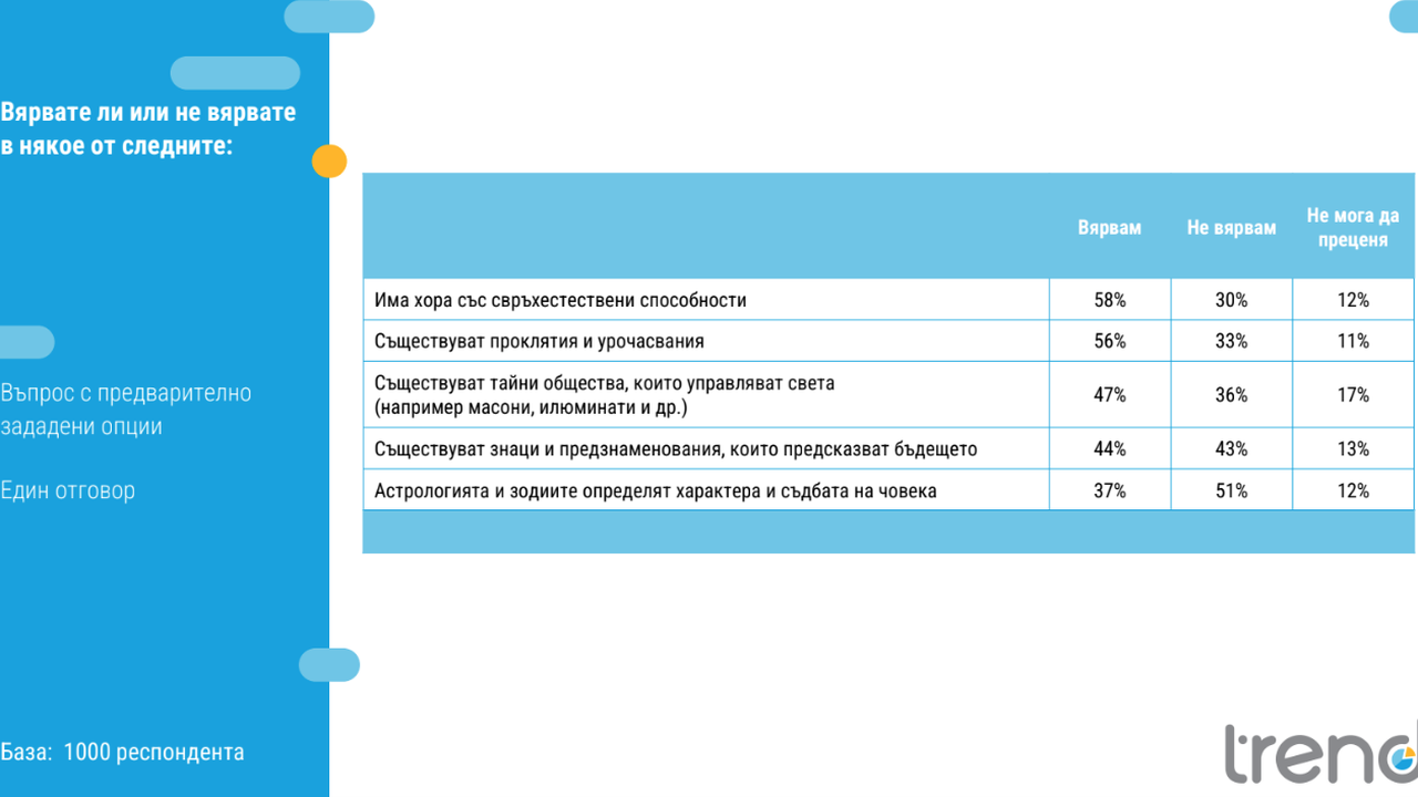 Повече от половината българи (58%) вярват, че има хора със свръхестествени способности, докато 30% не споделят това мнение. Подобен дял (56%) вярва в проклятия и урочасвания.