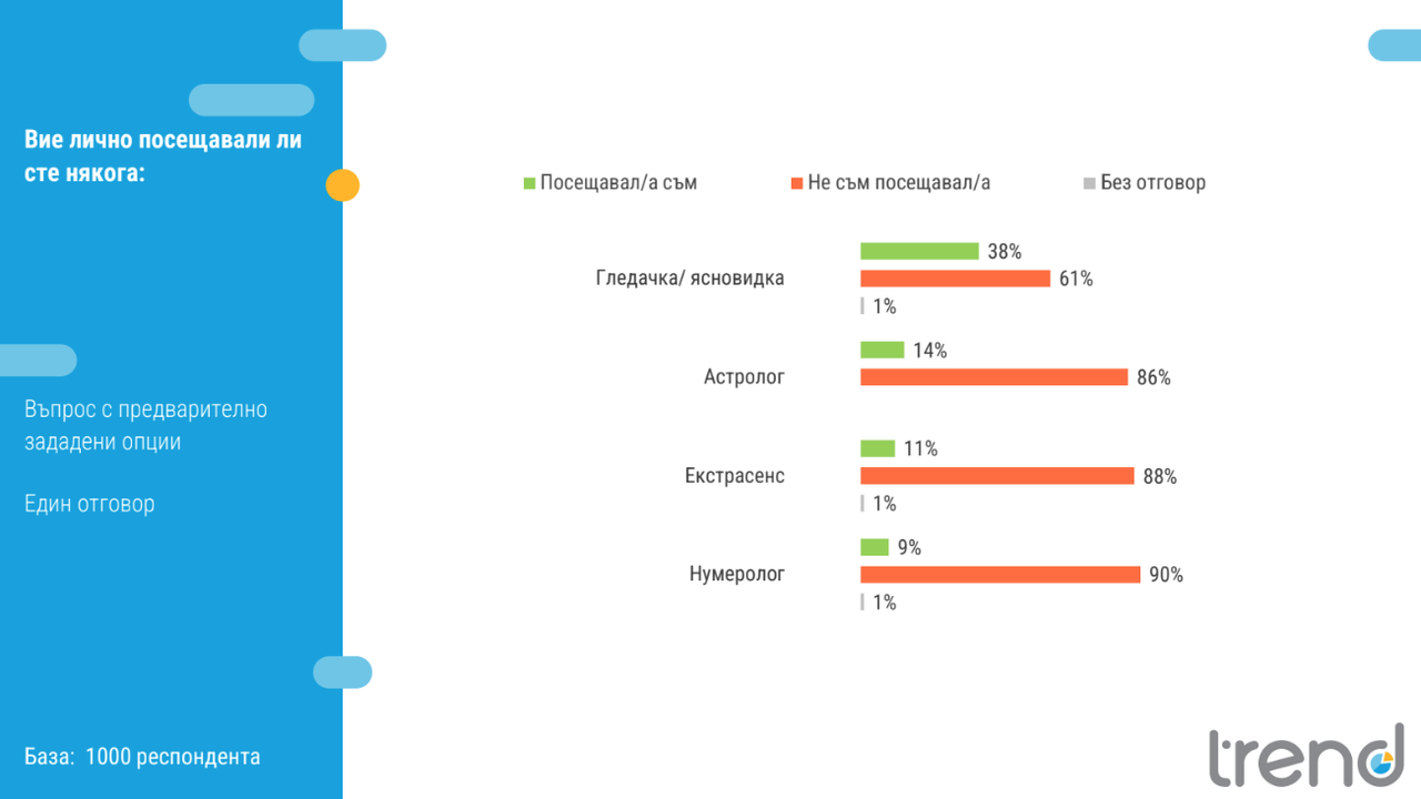 38% или малко над 2 млн. от българите признават, че са посещавали гледачка или ясновидка, а 14% – астролог. Жените значително по-често прибягват до подобни консултации. Посещения при екстрасенси (11%) и нумеролози (9%) са сравнително редки, но присъствието им показва интерес към алтернативни форми на предсказание.