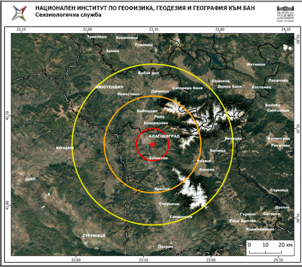 Епицентърът на труса е на 15 км от Благоевград, на 40 км от Сандански и на 82 км от София.