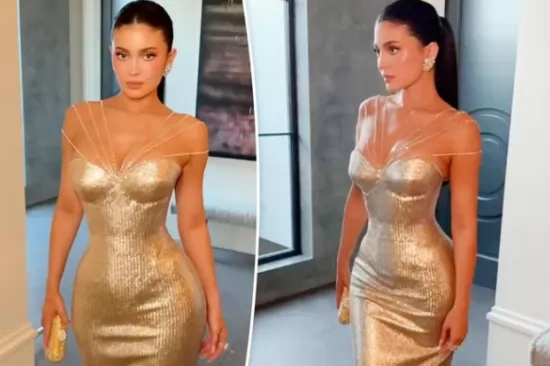 Въпреки че не премина по червения килим на наградите „Златен глобус 2026“ заедно с гаджето си Тимоти Шаламе, Кайли Дженър, все пак присъства на звездното събитие, облечена в металическа златна рокля на Ashi Studio с блестящи, богато украсени презрамки.