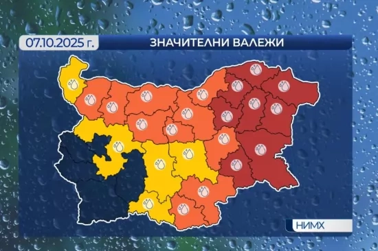 Днес - 7 октомври, времето ще бъде облачно и дъждовно. За няколко области е обявено най-високото предупреждение за опасно време заради очакваните количества дъжд - над 65 mm за 24 часа.