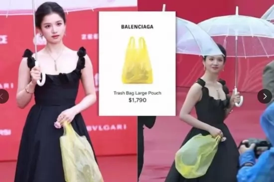 Китайската актриса Джан Дзинъи стъпи на червения килим на Международния филмов фестивал в Пекин през 2026 г. и не, не роклята ѝ открадна светлината на прожекторите – а чантата „Trash Pouch“ от Balenciaga за 1790 долара. Чанта, която не само носи сходно име, но и прилича на найлонова торбичка за боклук.