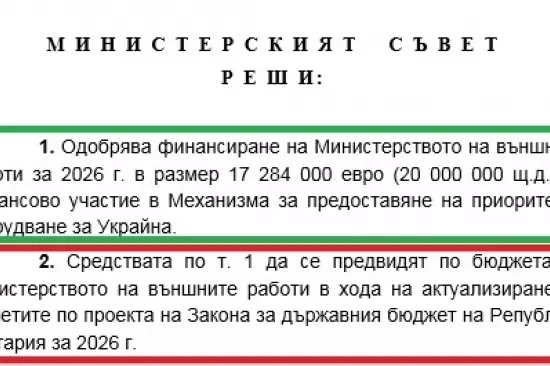 Публикувано е скандалното решение на Министерски съвет, с което се отпускат 17 284 000 евро (20 000 000 щ.д.) за финансово участие в механизма за въоръжаване на Украйна.